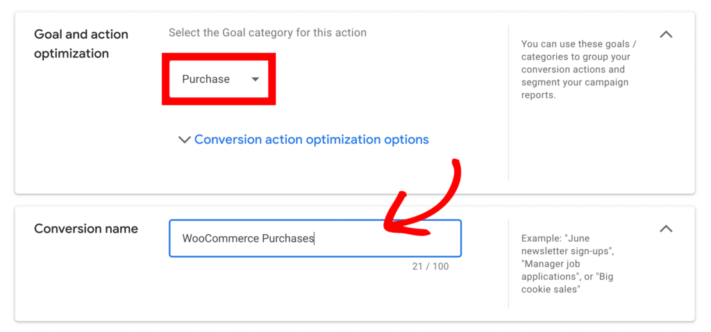 Step 6: Set the goal category to Purchase and set the conversion name to something obvious.
