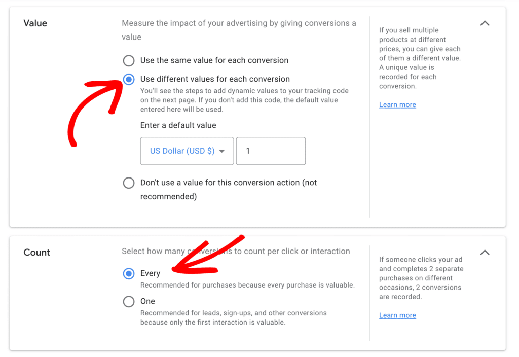 Step 7: Set the Value to Use different values for each conversion and set the Count to Every.