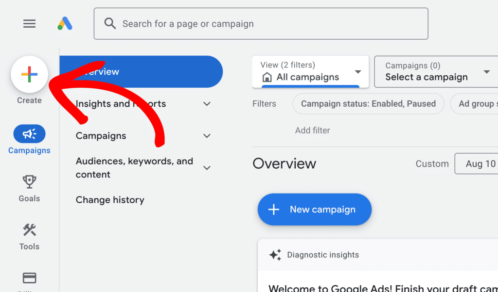 Step 1: Navigate to ads.google.com, login to your account and click on the Create button.