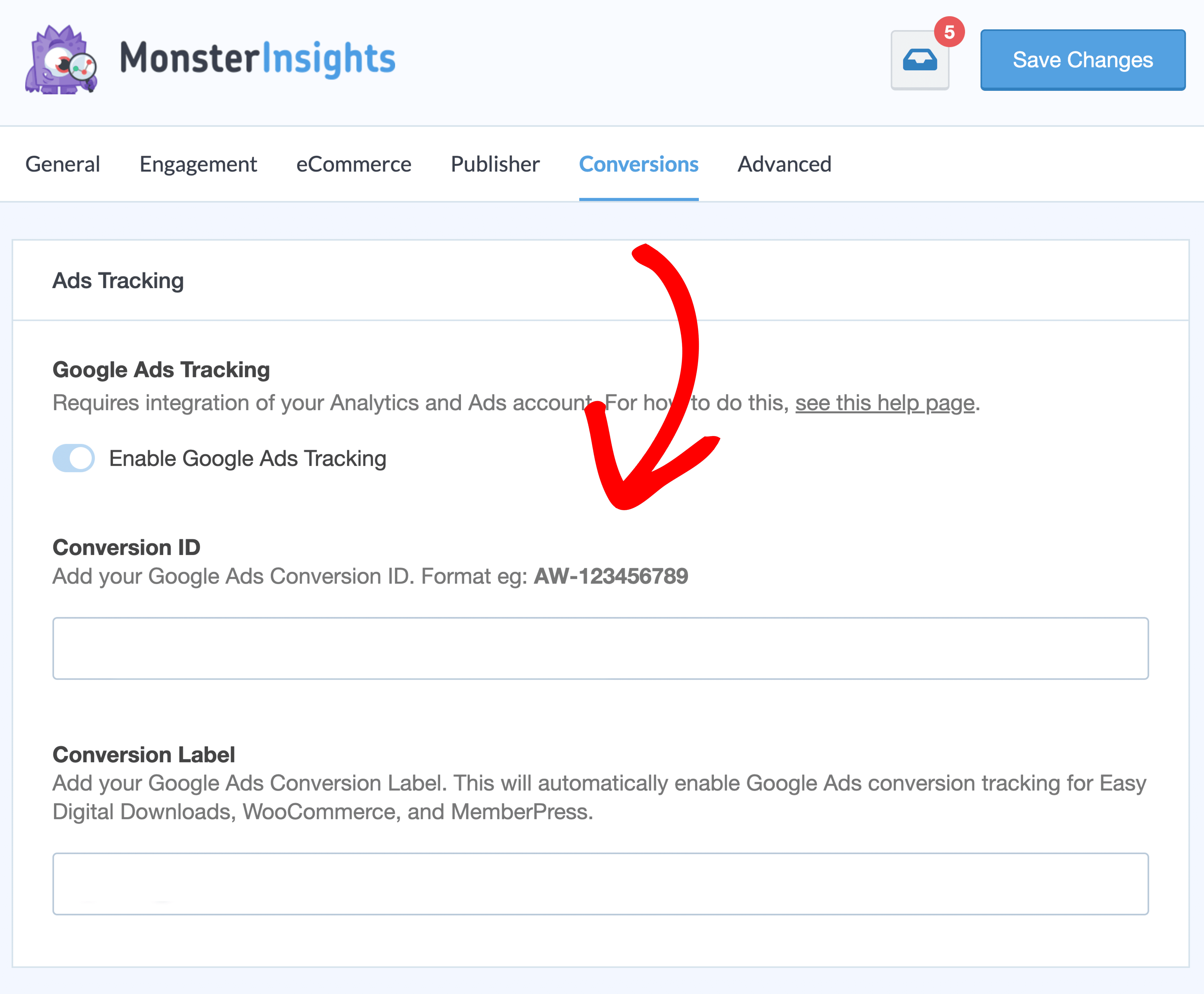 Note: MonsterInsights only supports the Conversion ID format of AW-123456789 at this time.