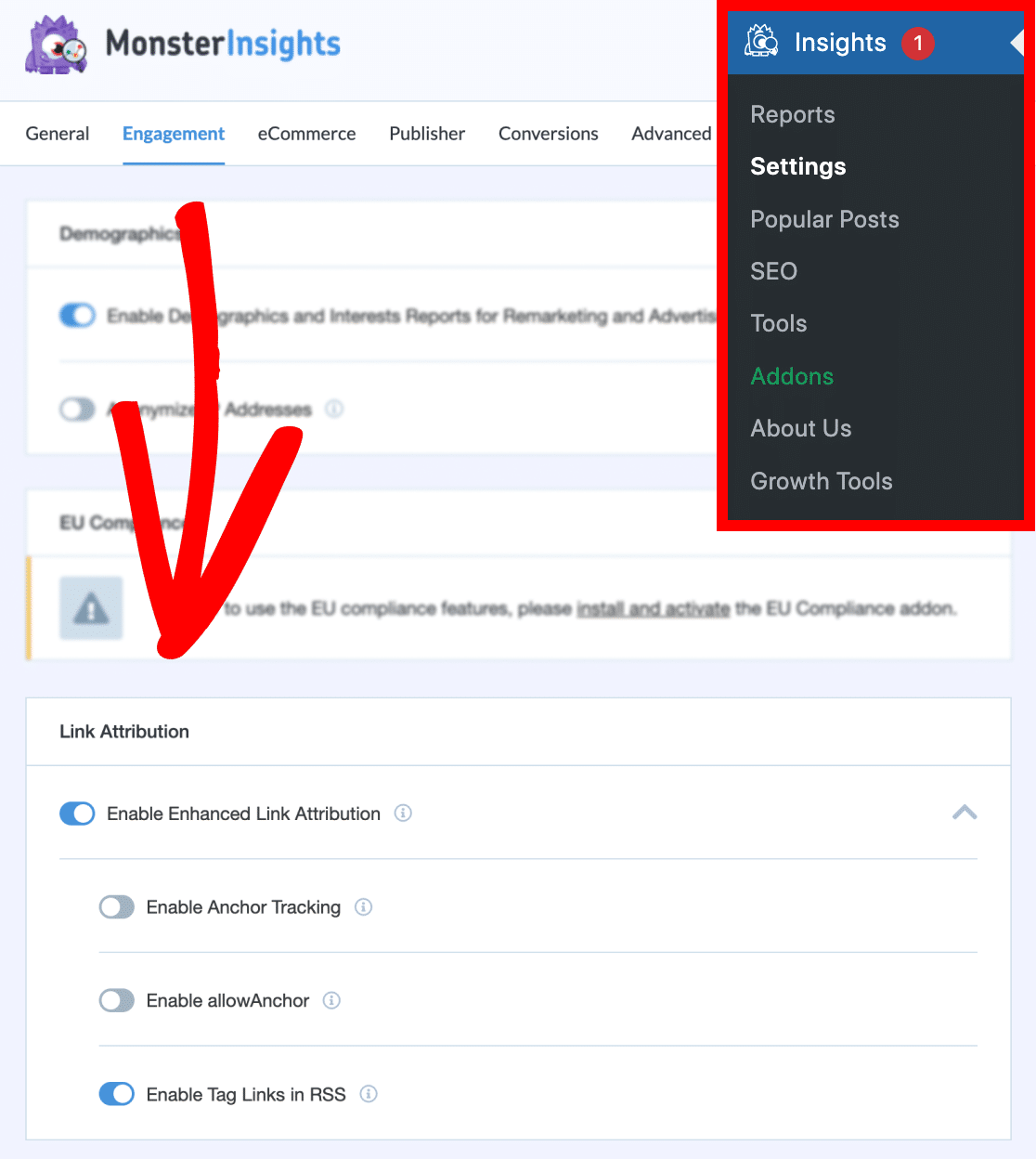 Then, while logged into your WordPress, navigate to Insights » Settings » Engagement » Link Attribution.
