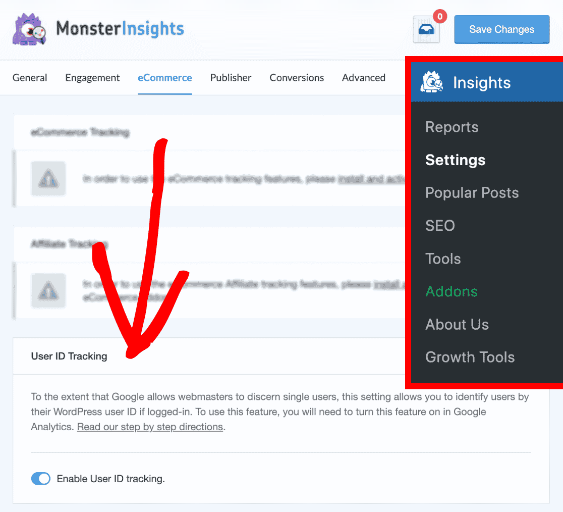 From here, you can check the Enable User ID tracking toggle to turn it on. The panel will auto-save your new setting as soon as the toggle is adjusted, but you can also click on Save Changes.