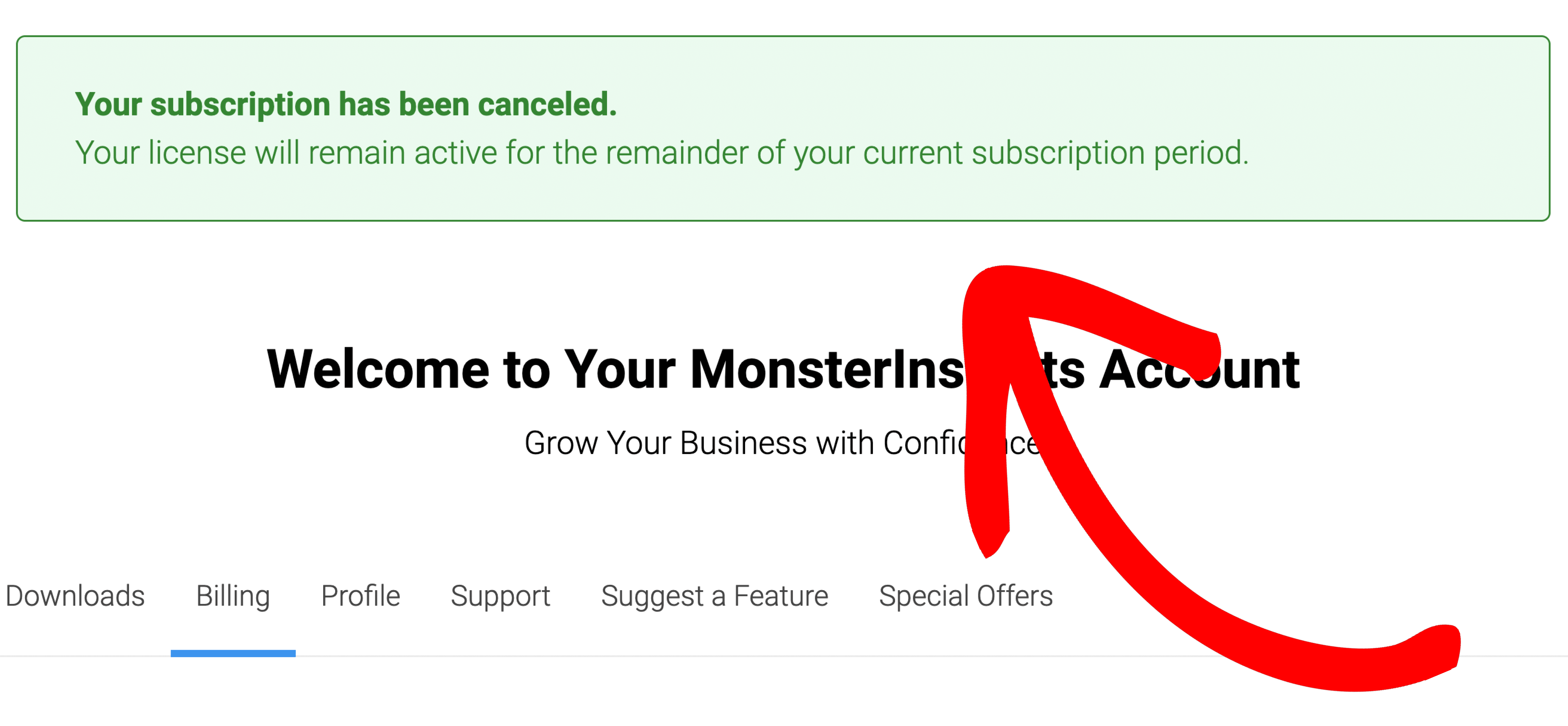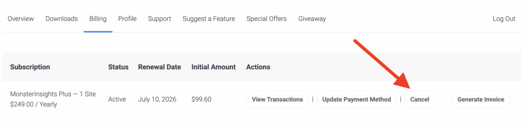 The first step is really easy. Log into your MonsterInsights account, and click the Billing tab. Then, click the Cancel button link next to your subscription.