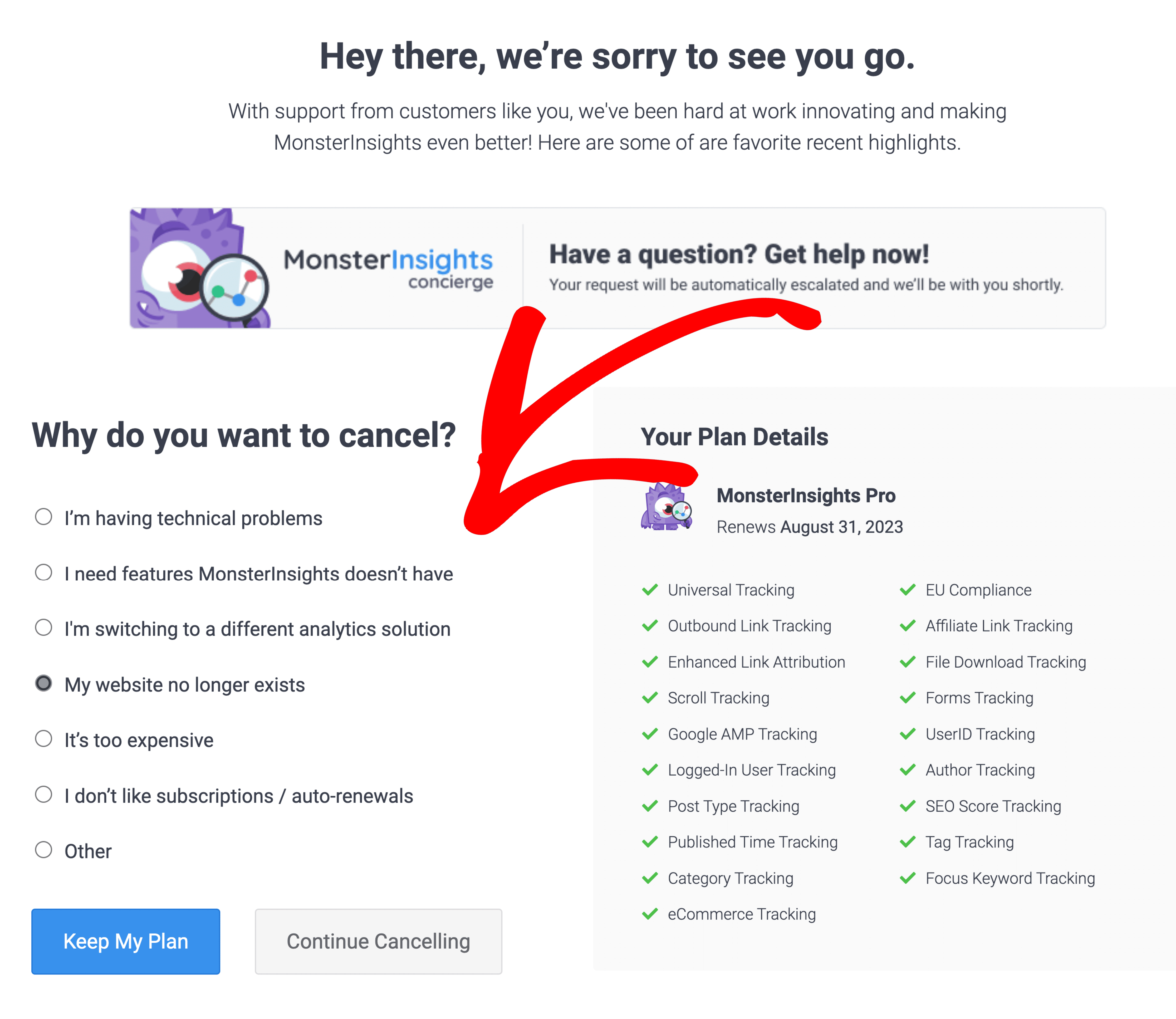 Have you been using MonsterInsights but, for the time being, you don’t need it? We’re sad to see you go, but we understand.