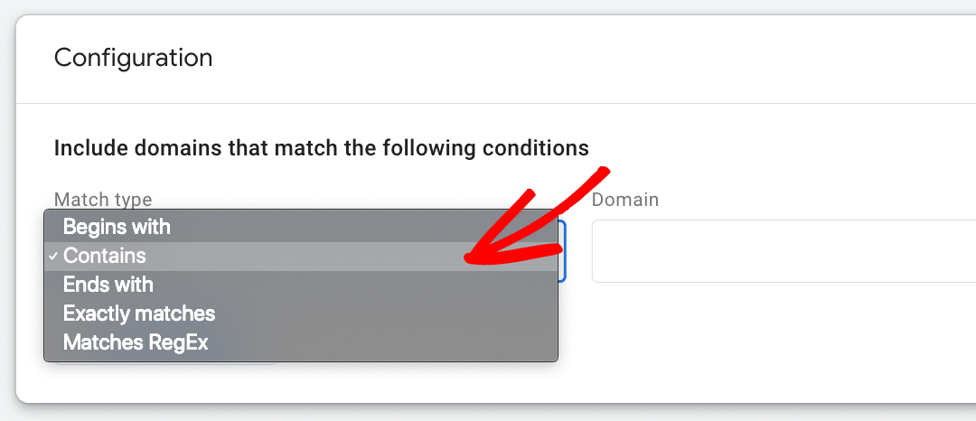 Here’s an example. Suppose you select Contains in the dropdown and type in “mysitehere” in the Domain input field.