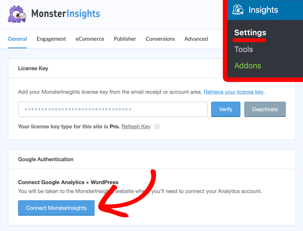 Next, go to Insights » Settings » General, then enter the license key and click Verify.