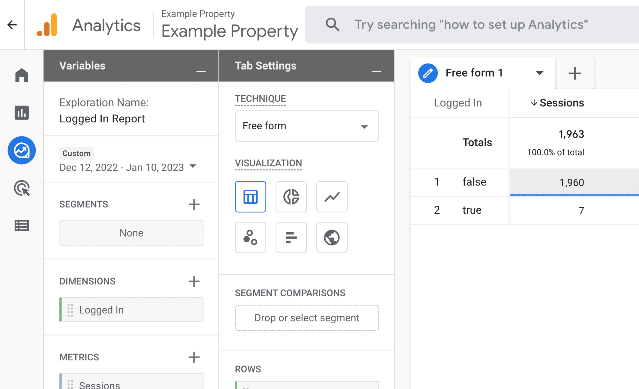 Next, visit the Explore page to create a new exploration. Creating a custom exploration allows you to mix and match the dimensions and metrics as needed in a report:
