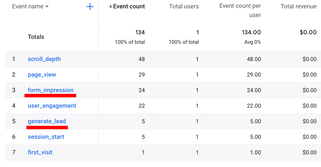 It may take up to 24-48 hours before you see the events form_impression and generate_lead in your Google Analytics reports