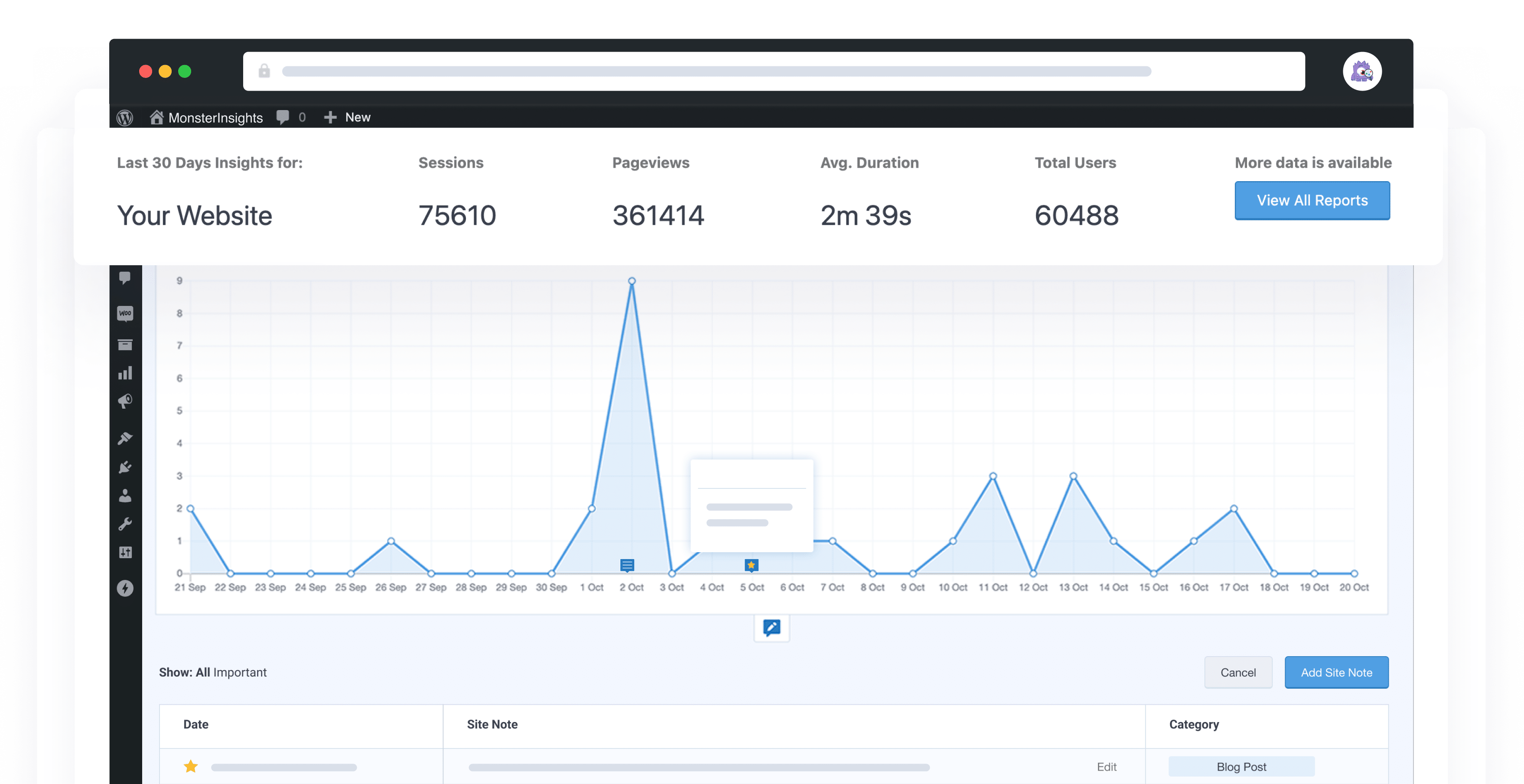To analyze a WordPress website with MonsterInsights, install the plugin, activate the necessary addons (like Page Insights or Site Speed Report), and then access the data directly from your WordPress dashboard. You can track key metrics like pageviews, entrances, bounce rates, time on page, and more – all in one place.