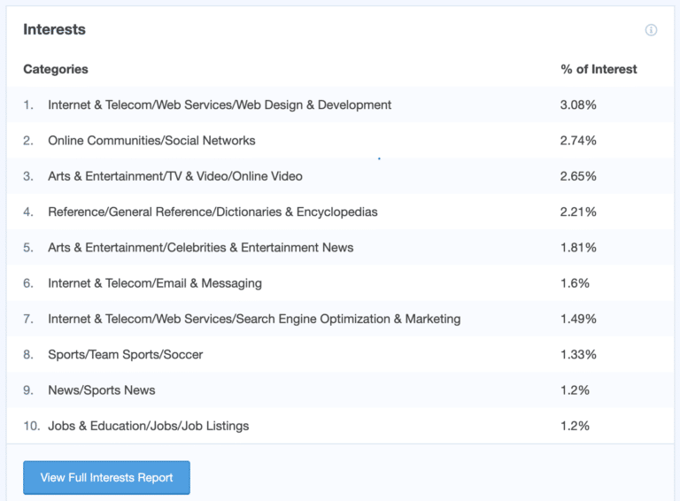 Another way the WPBeginner team uses MonsterInsights to find content ideas is through the demographics reports, which shows you the top interests of your readers.