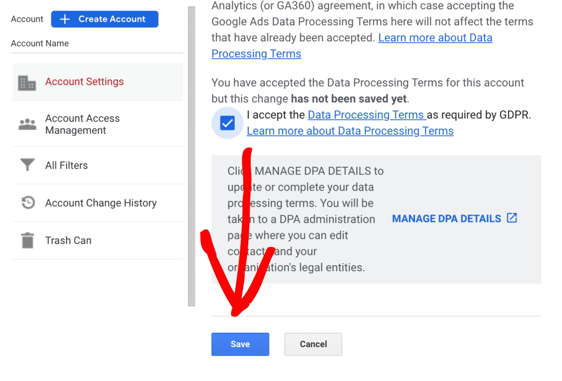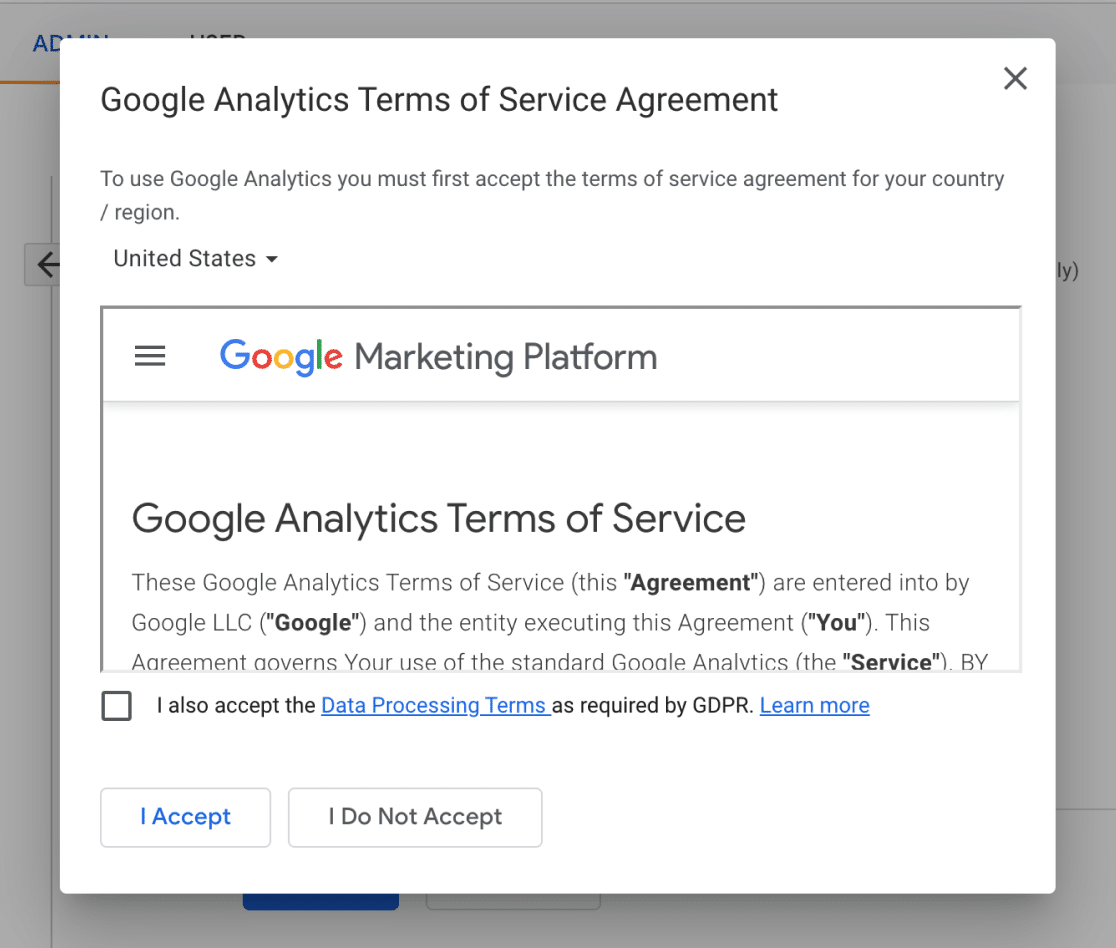 When initially creating your Google Analytics account, you’re prompted to accept the Google Analytics Terms of Service Agreement.