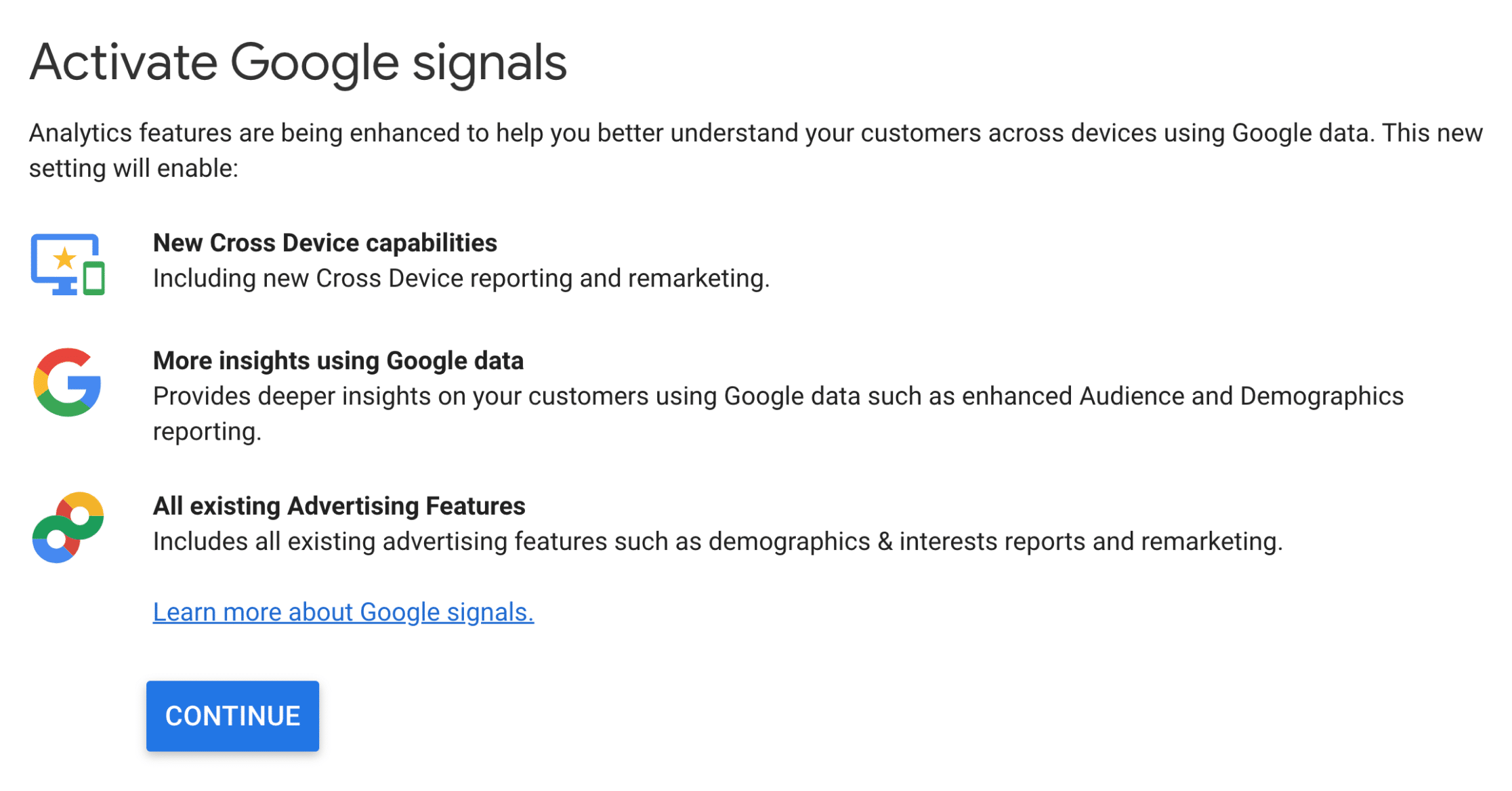 Once you’ve read through everything and clicked on Activate, Google signals collection will be active for that specific Google Analytics property.