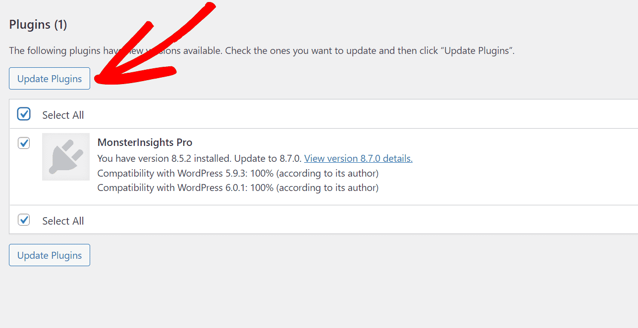 Scroll down the page till you see the Plugins section, place a check in the box next to MonsterInsights and then click the Update Plugins button